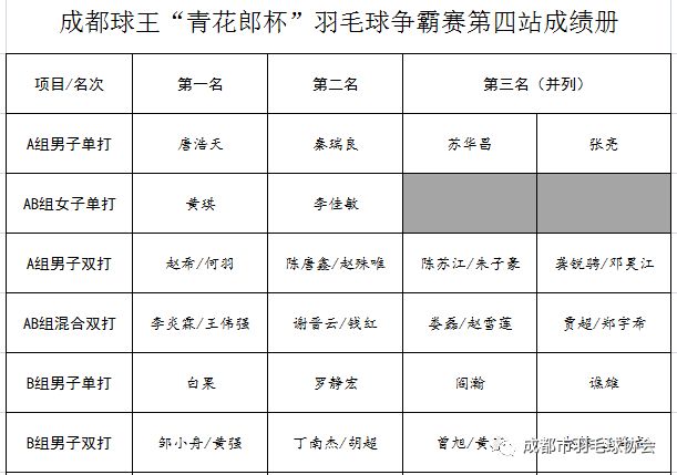 2018年1月20日和21日,将在四川双流国家羽毛球训练基地举行“运动成都”2017年成都球王“青花郎杯”羽毛球争霸赛总决赛,前四站分站赛获得资格的各组别前四名将同场竞技,争夺年度成都球王称号。